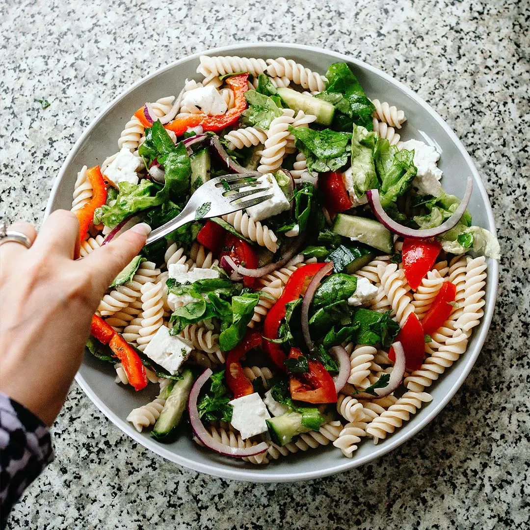 Kip: pasta, appel, bleekselderij, kipreepjes, walnoten, yoghurt, honing, mosterd en rucola.